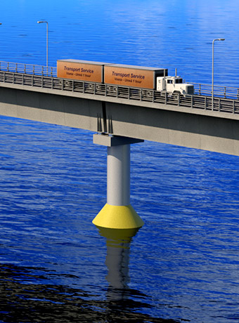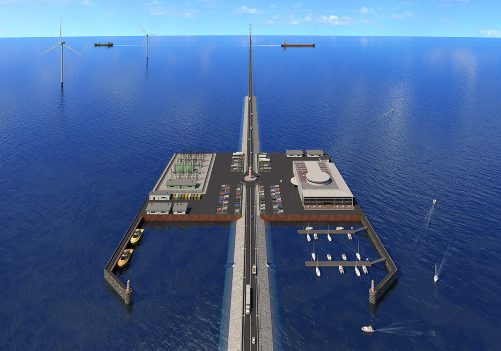 Latest update to Nordic Connector- project: Image has all the components needed for a fixed connection across the Baltic Sea between Finland and Sweden: embankment road, artificial island (with a hotel, marina, maintenance and rescue and substation for a wind farm), bridge and cable-stayed bridge.