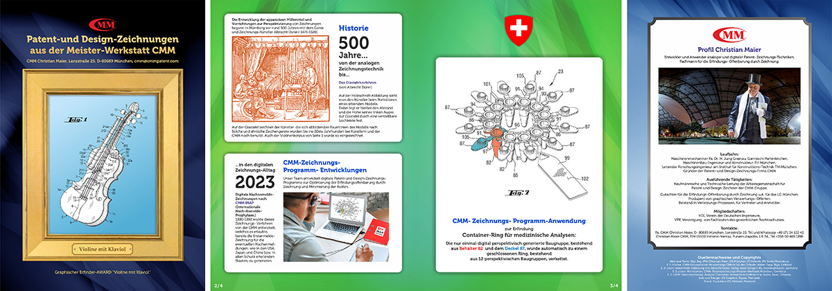 4-page newsletter brochure for a german patent company that creates patent- and design-drawings.