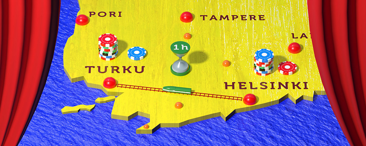Illustration to a blog post One Hour Train- Play by Antti Talvitie. The blog post is about the budget of a train connection between Helsinki and Turku in Finland.