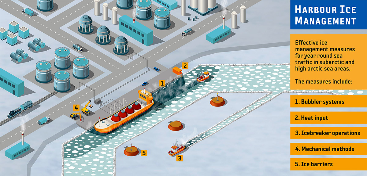 Arctic harbor in 3D with all the 5 ice management measures. Eranti Engineering: Harbour ice management.