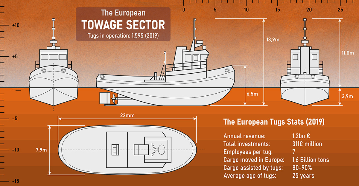 Illustration to show the dimensions of a tug. Also the information of towage sector in Europe. Image was updated for many presentations during the years. Orange color scale was chosen in order to have something different from other sea and water-themed slides.