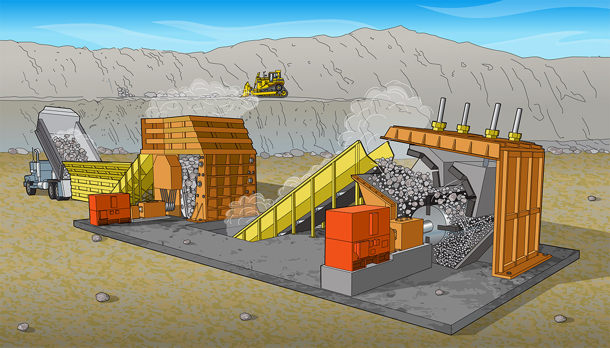 Colored drawings from line drawings created by 3D-models and CAD-drawings. Images shows a rock crushing machine in full and detail of the crushing system cut open.