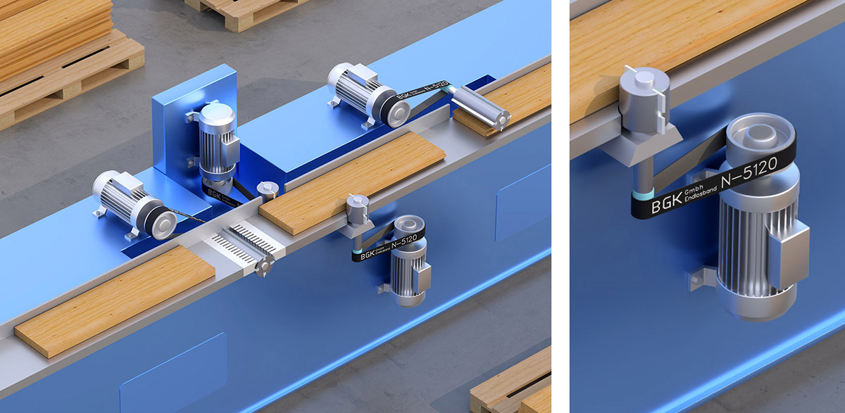 3D- visualization: Wood planer machine with special industrial belts.